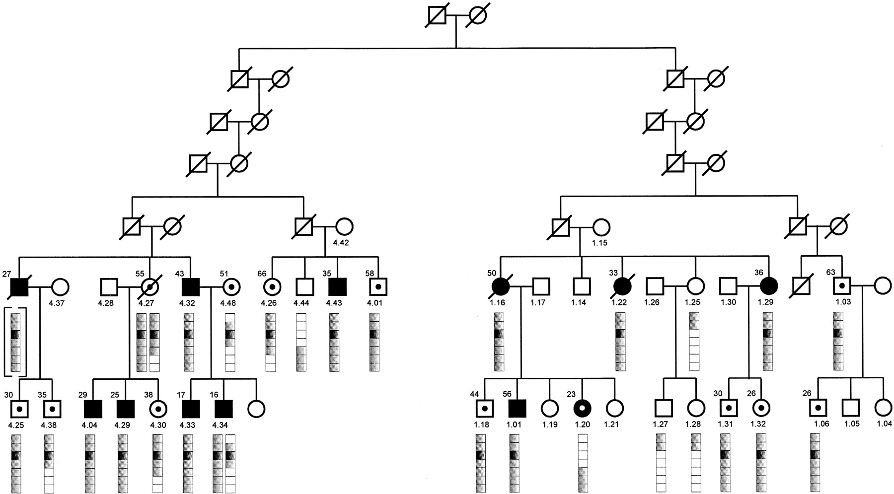Inheritance of the p16-Leiden allele in families 1 and 4 from a common ancestor in the late eighteenth century. Melanoma cases are shown in black. The bar underneath the family members depicts the seven-marker founder haplotype dispersed over ∼20 cM. The marker that migrates with p16-Leiden is indicated in black, and the markers that have lost the founder allele owing to recombinations in the families and in the population are depicted in white. All numbered members have been haplotyped, although only the p16-Leiden-related haplotypes are visualized. Melanoma-free carriers of the p16-Leiden allele are indicated by a black dot, whereas melanoma patient 1.20, who is no carrier of the p16-Leiden allele, is depicted by a white dot.