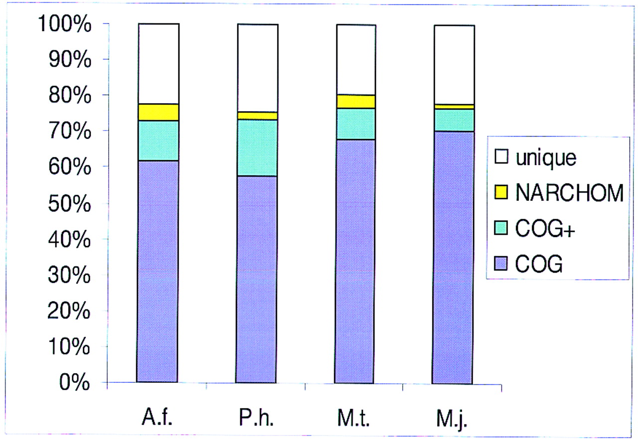 Conserved families and unique proteins encoded in the four complete archaeal genomes. (COGs+) Distant homologs of COGs; (NARCHOM) nonarchaeal homologs (only); (unique) proteins without detectable homologs in other species (for details see text); (Af)Archaeoglobus fulgidus; (Ph) Pyrococcus horikoshii; (Mt) Methanobacterium thermoautrophicum; (Mj)Methanococcus jannaschii.