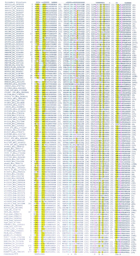 PIN—a novel domain superfamily with possible signaling function. For details for alignment construction and designations, see legend to Fig.8. Species name abbreviations; (Aae) Aquifex aeolicus; (Af)Archaeoglobus fulgidus; (At) Arabidopsis thaliana; (Bs) Bacillus subtilis; (Ct) Chlamydia trachomatis; (Dno) Dichelococcus nodosus; (Hi) Haemophilus influenzae; (Hs) Homo sapiens; (Mj) Methanococcus jannaschii; (Mta) Methanobacterium thermoautotrophicum; (Mtu)Mycobacterium tuberculosis; (Ngo) Neisseria gonorrhoeae; (Ph) Pyrococcus horikoshii; (Psy) Pseudomonas syringaea; (Rsp) Rhizobium sp. NGR234; (Sar)Sphingomonas aromaticivorans; (Sfl) Shigella flexner; (Sc) Saccaromyces cerevisiae; (Sp) Schizosaccharomyces pombe; (Ssc) Synechococcus PCC7002; (Sso) Sulfolobus solfataricus; (Ssp) Synechocystis sp; (Tfo)Thiobacillus ferrooxidans.
