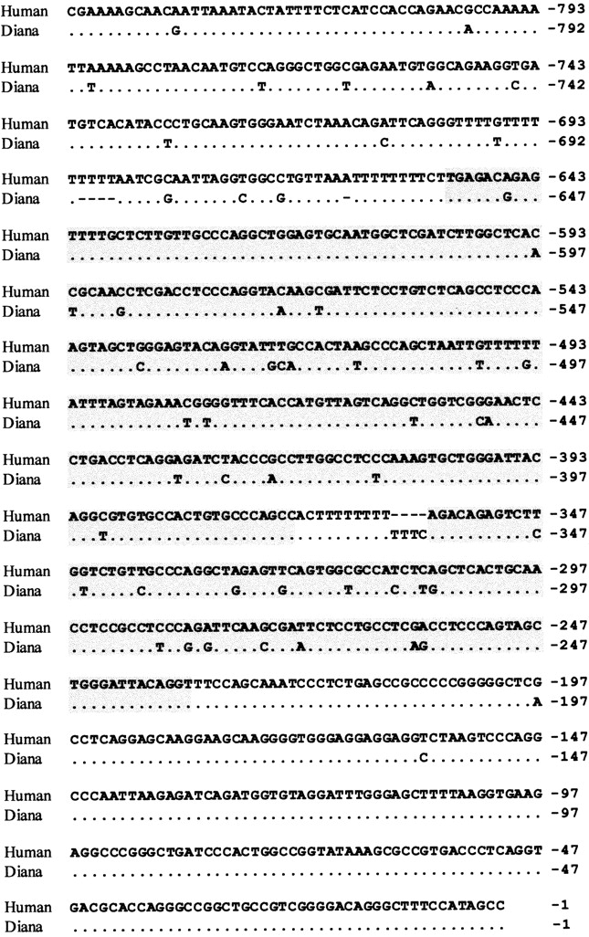 Alignment of the upstream region of the MW gene in humans and diana monkeys. The Alu repeat elements present in both sequences are shaded. Identity between the human and diana sequences is indicated by a dot.