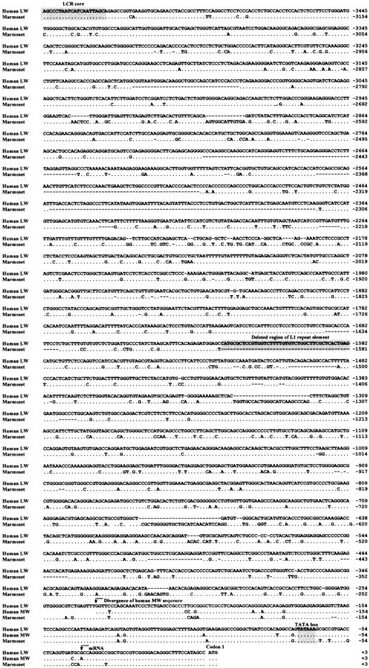 Nucleotide sequence of the 5′-flanking regions of the human LW gene and the marmoset MW/LW gene, plus the homologous region of the human MW gene. Identity to the human LW sequence is indicated by a dot. Indels are indicated by dashes in the deleted sequence. The shaded regions identify the LCR core, the deleted region of the L1 repeat element in the marmoset, and the TATA box. Marmoset sequence, GenBank accession no. AF155218.