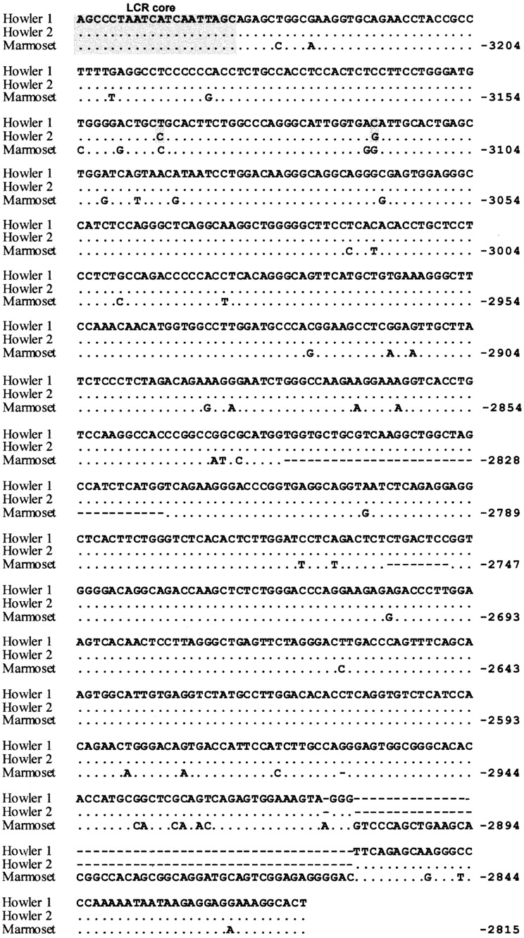 Nucleotide sequence of the two locus control regions identified in the howler monkey, aligned with the corresponding region in the marmoset. The numbering of the marmoset sequence corresponds to the full sequence shown in Fig. 3. Identity of the other two sequences to howler sequence 1 is indicated by a dot.