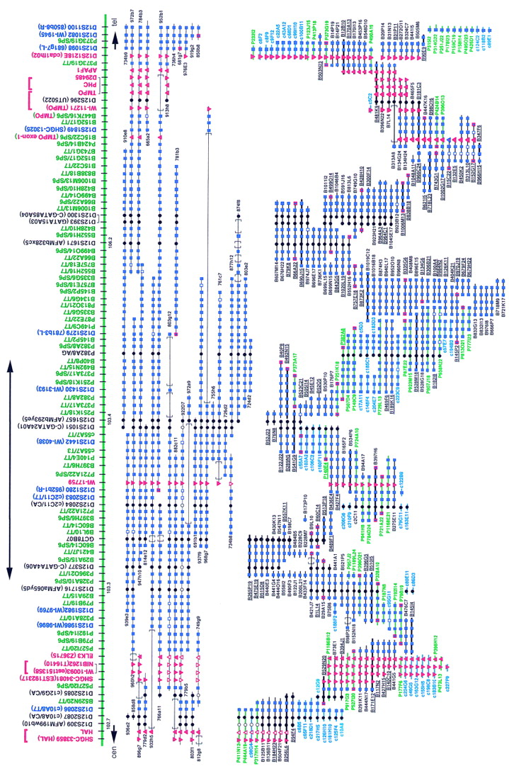 Integrated physical map of the 12q22 deleted region in male GCTs. The map between the interval SHGC-33859 (proximal) and D12S1100 (distal) is composed of 42 previously mapped YACs and 168 BACs, 49 PACs, and 52 cosmids isolated in this study. The solid green bar (top) represents the chromosomal region in proximal to distal orientation. The markers ordered on the contig are shown above the green bar (distances in the map are not to scale). All markers shown in green and P382A8/AG (shown in black) were generated in this study by sequencing ends of the clones. Markers are color-coded as follows: (blue and green) nonpolymorphic; (red) EST/gene; (black) polymorphic. Red brackets above the markers indicate that the ESTs are in the same unigene cluster. Small black brackets above the green line indicate that the relative order of the markers could not be determined unambiguously. The numbers below the green line indicate the genetic map position on chromosome 12 (Généthon map). The first level of the map below the green line represents YACs (black lines); the second level (below the YAC contig) represents BAC, PAC, and cosmid clone contig. The prefix B denotes BACs (black), P denotes PACs (green), and c denotes cosmids (blue). The STS content of each clone is indicated by symbols: (black circle) polymorphic marker; (blue square) nonpolymorphic marker; (blue square with red border) clone-end marker generated by sequencing; (downward red triangle) EST; (upward red triangle) gene; (upward red triangle with blue border) gene sequence identified from an end sequence. Open symbols indicate that the marker was not tested. A bracket within YAC or BAC clone indicates lack of marker(s), which may represent internal deletion. The large bidirectional arrow (top) indicates the minimal region of deletion. BAC clones drawn in thick, black lines represent minimal tiling path. Underlined clones indicate fingerprinted clones.