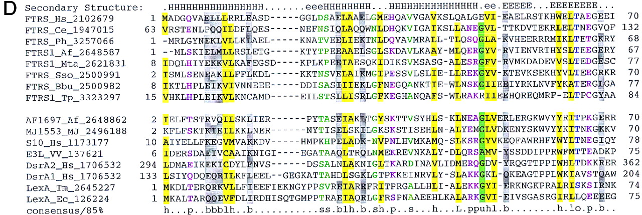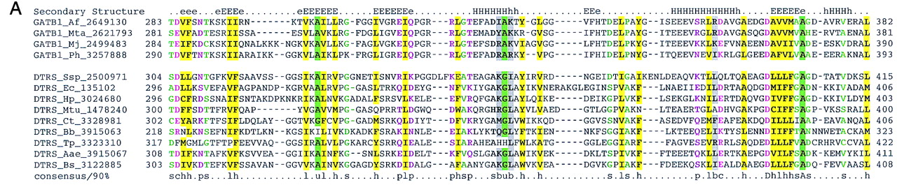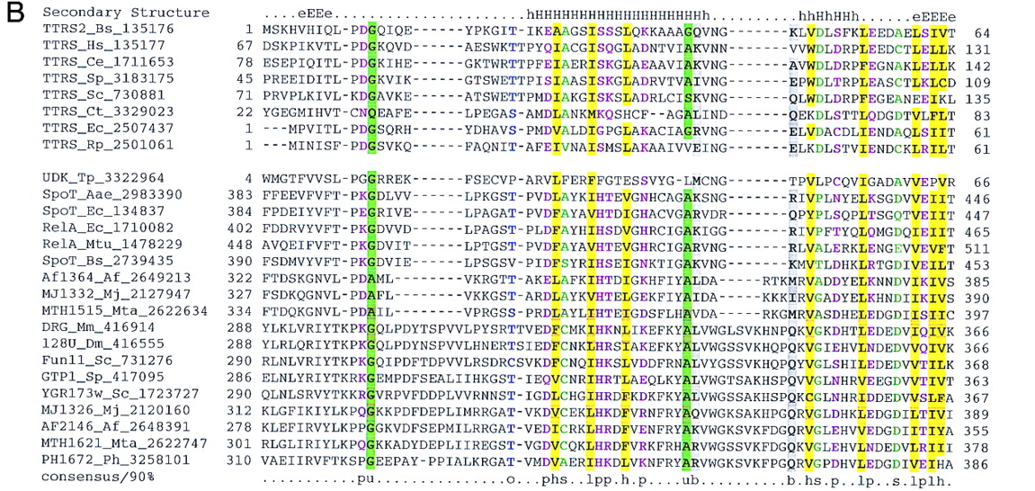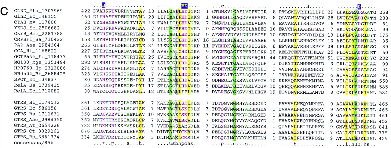 Previously undetected domain conservation in aaRS and proteins of other functions. (A) The GAD domain in bacterial AspRS and archaeal glutamyl-tRNA amidotrnasferases (GatB). (Top block of sequences) Archael GatB; (bottom block) bacterial AspRS. (B) The TGS domain in ThrRS, guanosine polyphosphatases (SpoT), OBG family GTPases, and uridine kinase (UDK) from Treponema. (Top block of sequences) ThrRS; (bottom block) other proteins containing the TGS domain. (C) The inactivated HD hydrolase domain in bacterial GlyRS β-subunit. (Top block of sequences) A selected subset of the HD superfamily hydrolases; (bottom block) β-subunits of bacterial GlyRS. (D) The winged helix–turn–helix domain in PheRS α-subunits from eukaryotes, archaea, and spirochaetes. (Top block of sequences) PheRS; (bottom block) a selected subset of other proteins containing the winged-HTH domain. The alignments were constructed on the basis of the PSI-BLAST results using the ClustalW program. The inclusion of each sequence in the alignments was statistically supported by PSI-BLAST results, with an e-value of at least 0.01. The left column includes the protein (gene) names, the abbreviated species name, and the gene identification (GI) nos. (following the underscore). A consensus derived using a 90% or an 85% cutoff is shown underneath the alignment, and the respective alignment columns are highlighted; (b) a big residue (E,K,R,I,L,M,F,Y,W); (h) a hydrophobic residue (A,C,F,I,L,M,V,W,Y); (s) a small residue (A,C,S,T,D,N,V,G,P); (u) a tiny residue (G,A,S); (o) a hydroxy residue (S,T); (p) a polar residue (D,E,H,K,N,Q,R,S,T); (c) a charged residue (K,R,D,E,H); (+) a positively charged residue (K,R,H). InA,B, and D, the numbers indicate the positions of the first and last residue of the aligned region in the respective protein sequence. The alignment in C consists of conserved blocks separated by variable spacers; the lengths of the spacers and the distances between the protein termini and the aligned regions are indicated by numbers. The secondary structure elements predicted using the PHD program, with the multiple alignment as the input (Rost and Sander 1994), is shown above the alignment inA, B, and D. [E(e)] indicates extended conformation (β-strand); [H(h)] α-helix; uppercase letters indicate the predictions made with a high level of confidence. InC, the line above the alignment indicates the predicted catalytic residues of the HD superfamily hydrolases (Aravind and Koonin 1998) that are replaced in the β-subunits of GlyRS. (Aae) A. aeolicus; (Af) A. fulgidus; (At) A. thaliana; (Bb) B. burgdorferi; (Bs) B. subtilis; (Ce) C. elegans; (Ct) C. trachomatis; (Dm) D. melanogaster; (Ec) E. coli; (Hi) H. influenzae; (Hs) H. sapiens; (Mj) M. jannaschii; (Mta) M. thermoautotrophicum; (Mtu) M. tuberculosis; (Ph) P. horikoshii; (Sp) S. pombe; (Sso) S. solfataricus; (Ssp) Sy. sp.; (Tm) Th. maritima; (Tp) T. pallidum; (VV) vaccinia virus.