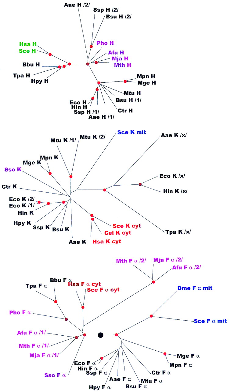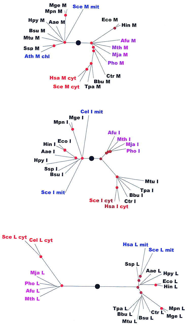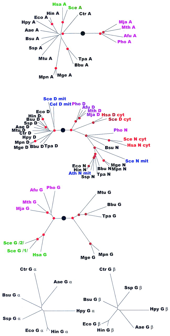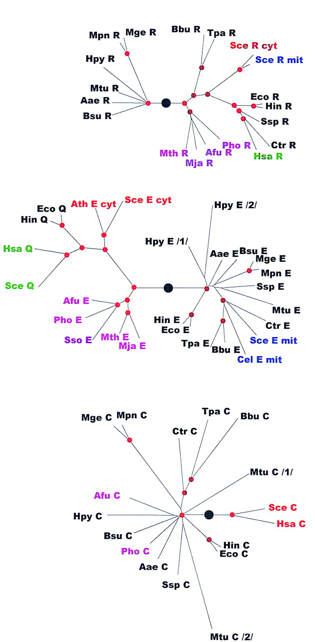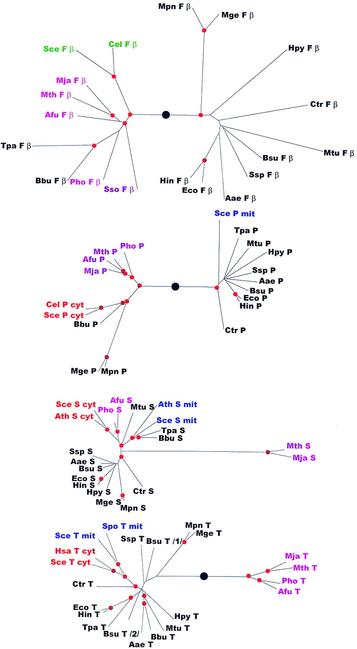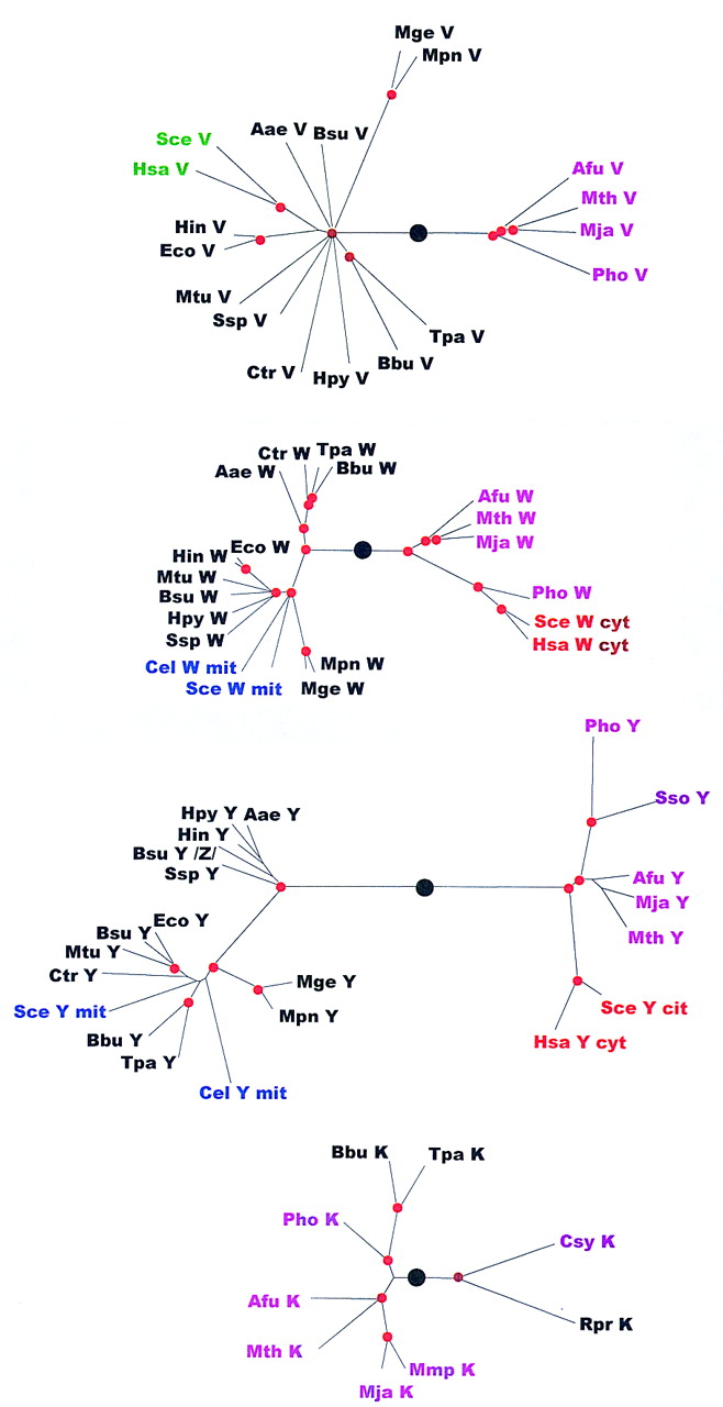 Phylogenetic trees for aaRSs. The trees are shown as unrooted, but a large black circle denotes the likely root position inferred by a combination of synapomorphy analysis, clustering by sequence similarity and midpoint rooting (see Table 2). Red circles mark statistically supported nodes (> 70% bootstrap support for both the neighbor-joining and the Fitch–Margoliash methods). Three-letter species labels are as in Fig. 1. Labels for archaeal proteins are shown in magenta; eukaryotic cytoplasmic in red; eukaryotic organellar in blue; eukaryotic without indication of origin in green; bacterial in black. Additional abbreviation: (Sso) S. solfataricus.