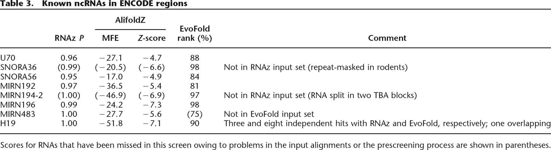 Scores for RNAs that have been missed in this screen owing to problems in the input alignments or the prescreening process are shown in parentheses.
