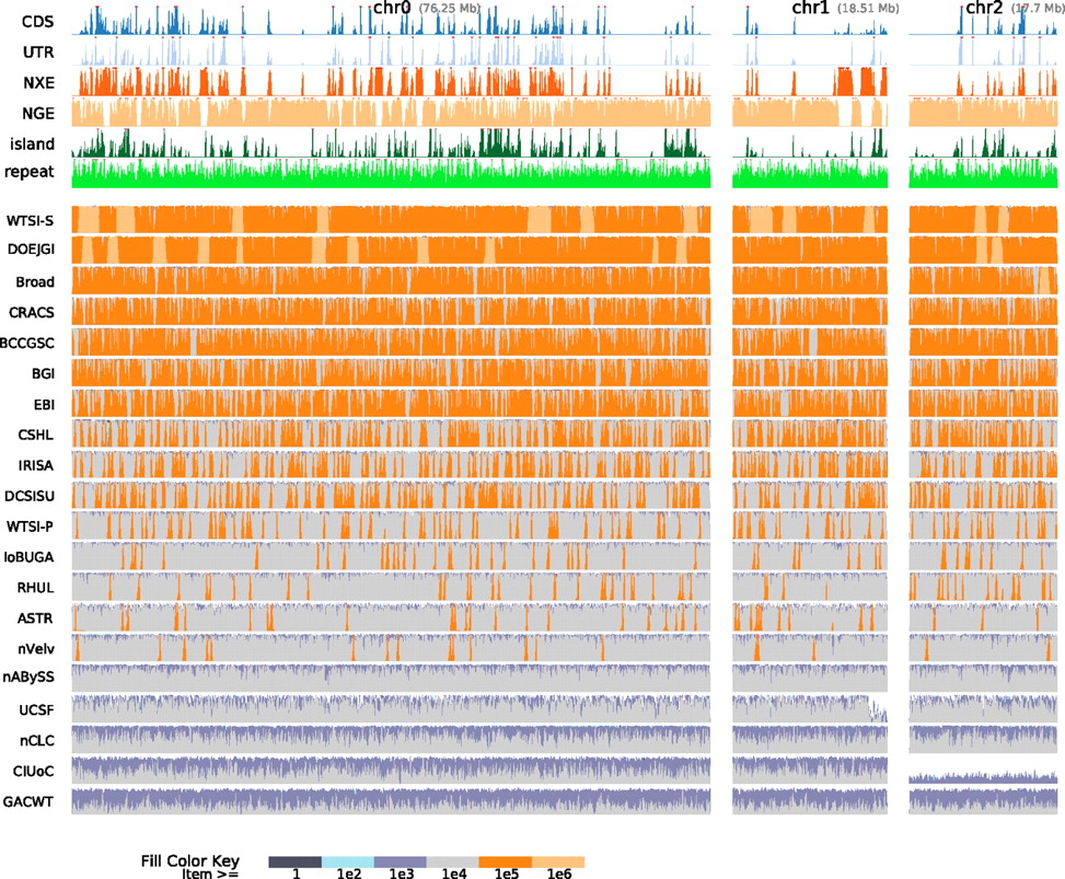 Assembly coverage along haplotype α1 stratified by scaffold path length weighted overall coverage. The top six rows show density plots of annotations. (CDS) Coding sequence; (UTR) untranslated region; (NXE) nonexonic conserved regions within genes; (NGE) nongenic conserved regions; (island) CpG islands; (repeats) repetitive elements. The remaining rows show the top-ranked assembly from each group, sorted by scaffold path length weighted overall coverage. Each such row is a density plot of the coverage, with colored stack fills used to show the length of scaffold paths mapped to a given location in the haplotype. For example, the left-most light-orange block of the WTSI-S assembly row represents a region of haplotype α1 that is almost completely covered by a scaffold path from the WTSI-S assembly greater than one megabase in length.