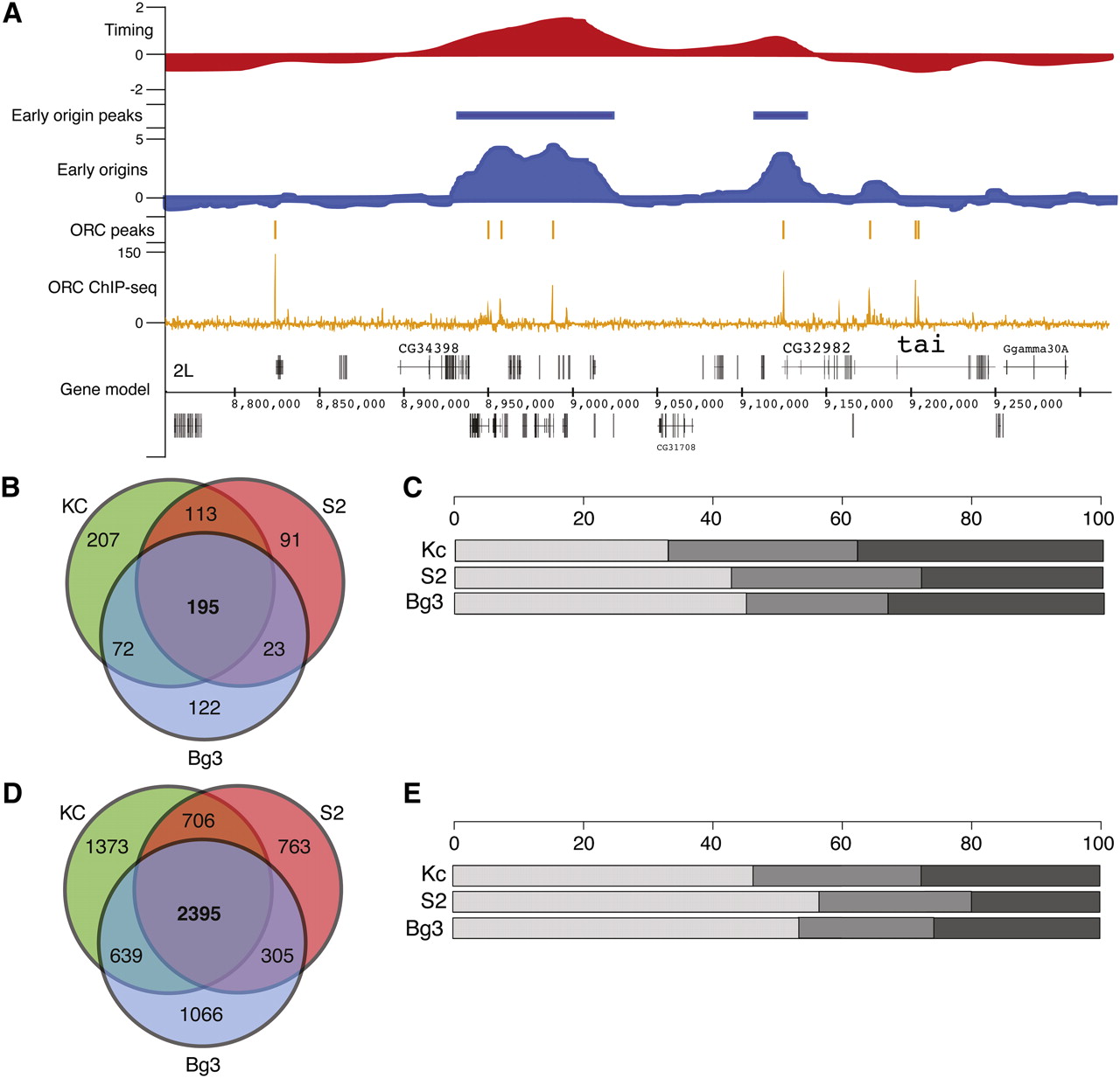 The Drosophila replication program across three cell lines. (A) Replication program in S2-DRSC cells. Genome browser track of whole-genome S-phase replication timing profiles as the log2 ratio of early to late replicating sequences (red), early origin activity as the log2 ratio of BrdU enrichment to input DNA (blue), ORC-binding sites as input corrected ChIP-seq tag depth (orange), and gene models for a 500-kb region of chromosome 2L. (B) Overlap of early origins in three cell lines. The Venn diagram shows the overlap in total early origin peaks from each cell line. (C) Distribution of early origin meta-peaks per cell line. The percentage of early origin peaks found in three cell lines (light gray), two cell lines (medium gray), or one cell line (dark gray). (D) Overlap of ORC ChIP-seq peaks in three cell lines. As in B, the Venn diagram depicts the overlap in ORC peaks for each cell line. (E) Distribution of ORC meta-peaks per cell line. Same as C for ORC ChIP-seq peaks.