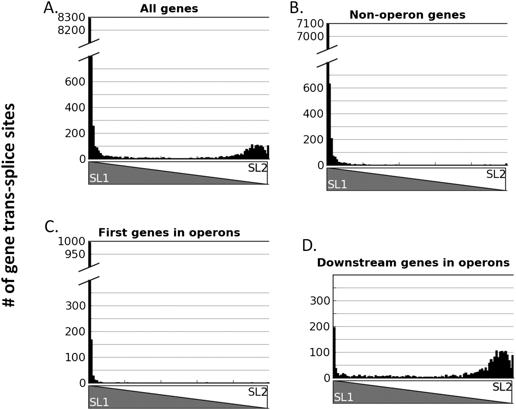 SL1/SL2 trans-splicing ratios at each trans-spliced gene. Histogram showing the number of gene trans-splice sites with indicated SL1:SL2 proportion on the y-axis. The x-axis shows the proportion SL1/SL2 by the opposing triangles and ranges from 100% SL1 to 100% SL2. (A) All genes; (B) non-operon genes; (C) first genes in operons; (D) downstream genes in operons.