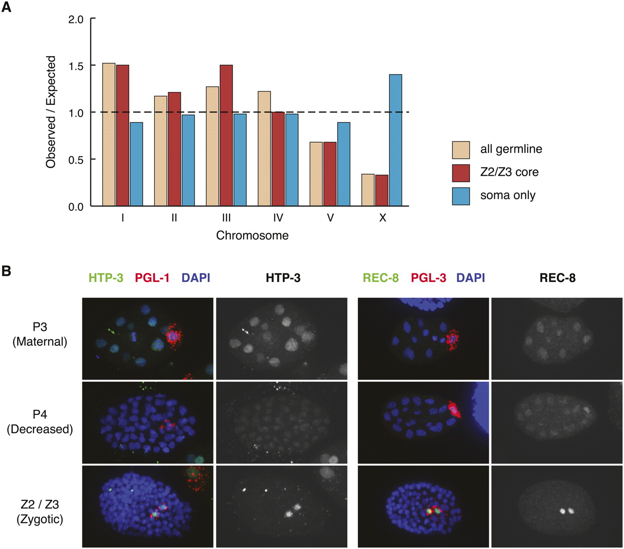 Global characteristics of Z2/Z3-enriched gene expression. (A) Z2/Z3-expressed genes are underrepresented on the X chromosome. The chromosomal locations of genes expressed in the adult germline (“all germline”) (Reinke et al. 2004), genes identified from tiling array profiles of Z2/Z3 minus hypodermis-expressed genes (“Z2/Z3 core”, see text), and genes identified from tiling array profiles of adult hermaphrodite somatic cells (“soma-only”) were determined. Observed/expected was calculated by comparing the number of genes per chromosome from each data set to the entire number of protein-coding genes on that chromosome. (B) Meiotic proteins are expressed in Z2/Z3. Antibodies to HTP-3 and REC-8 were used to stain mixed stage embryos, along with PGL-1 or PGL-3 to mark P granules in Z2/Z3. Stage of germline development is indicated on the left, with the earliest stage shown (P2/P3) likely showing persistence of maternal protein, the P4 stage showing decreased protein in the P4 cell, and the Z2/Z3 stage showing an increase in protein level in Z2 and Z3.