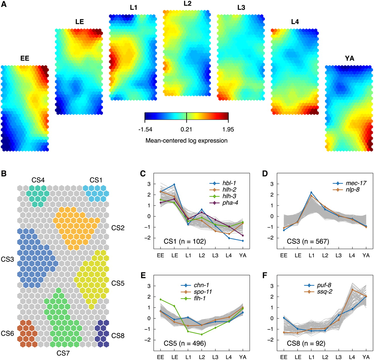 Expression patterns during C. elegans development. (A) Component planes of a self-organizing map (SOM) fitted to the developmental stage data set. Each component plane visualizes mean-centered gene expression (log2-scale) in one stage as a color gradient from blue to red indicating low and high expression, respectively (see color bar): EE indicates early embryos; LE, late embryos; L1, larvae stage 1; L2, larvae stage 2; L3, larvae stage 3; L4, larvae stage 4; and YA, young adults. (B) Eight regions (CS1–CS8) of the SOM, which robustly clustered together, are color-coded (see main text for details). (C–F) Mean-centered log2-expression values of genes corresponding to four of the clusters in B are plotted for the 50% of best-fitting genes (additional clusters in Supplemental Fig. S20). Colored lines indicate the expression of a selected subset of genes (see key). mec-17 and nlp-8 encode neuron-enriched transcripts; chn-1 and spo-11 are highly expressed in the adult hermaphrodite gonad; puf-8 is highly expressed in embryonic and adult germline; and ssq-2 encodes a sperm-specific transcript. For other labeled genes, see Results.