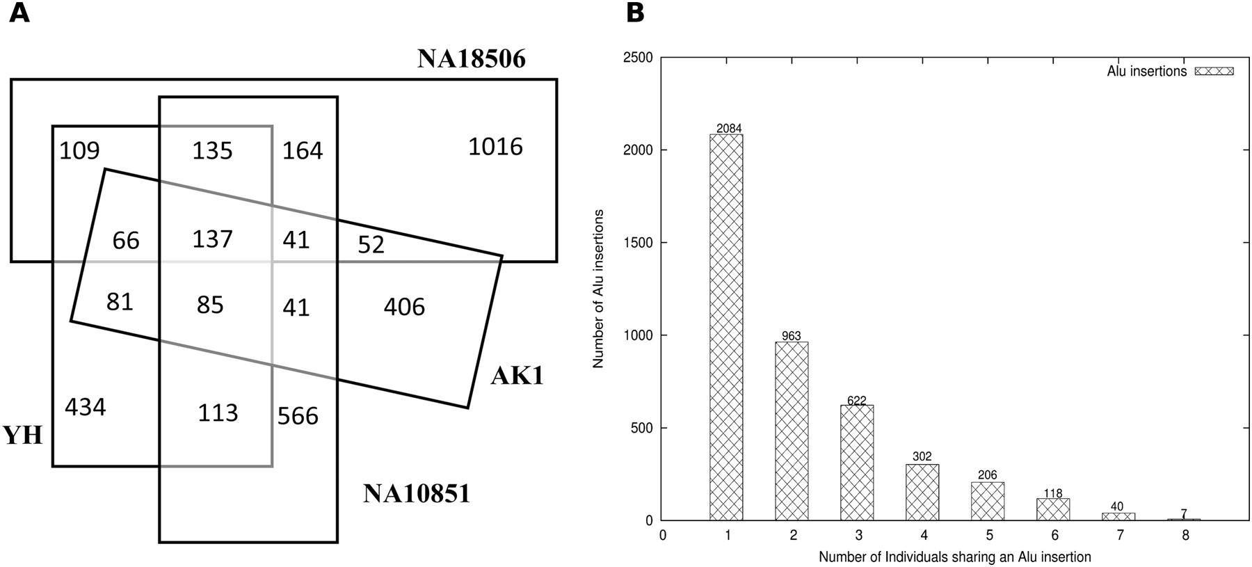 Shared Alu polymorphisms. (A) A Venn diagram of shared novel Alu insertions among four genomes. The African (NA18507) genome shows the greatest number of individual-specific Alu integration polymorphisms when compared with the Asian (AK1 and YH) and European (NA10851) genomes. This effect holds even after correcting for differences in genome coverage. (B) The histogram shows the number of Alu insertions that are unique and shared among two or more genomes.