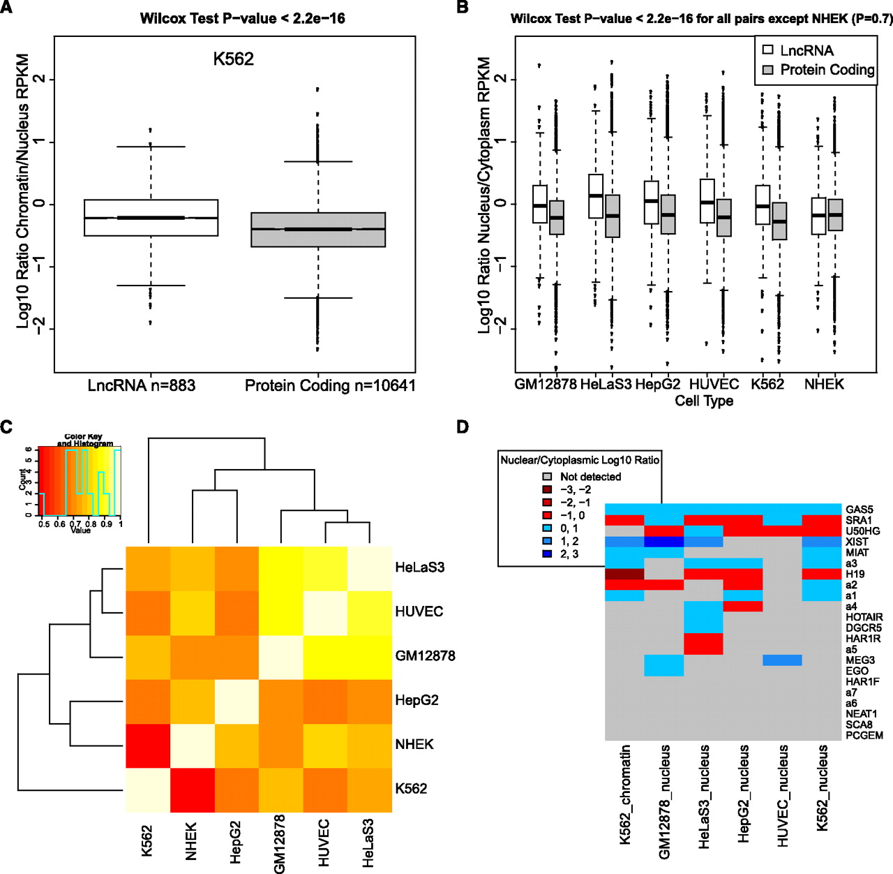 LncRNAs are enriched in the cell nucleus and chromatin. (A) Shown are the chromatin/cytoplasm expression ratios of lncRNAs and protein-coding transcripts in K562 cells. Data are represented as log10-transformed ratios of RPKM values (log10[chromatin RPKM/cytoplasm RPKM]). The data correspond to the 310 lncRNA and 10,287 protein-coding transcripts that fall below a 0.1 IDR threshold in both nuclear and chromatin data. (B) The boxplot, similar to that in A, shows the nucleus/cytoplasm expression ratios for the six ENCODE cell lines where data is available. Between 290 and 758 lncRNAs passed IDR cutoff and are shown, compared with between 16,561 and 20,666 protein-coding transcripts. (C) Nuclear enrichment of lncRNAs is correlated between cell types. The heatmap shows pairwise Pearson correlation values for the set of 98 lncRNA transcripts that passed IDR cutoff in all six ENCODE cell lines. Correlation was calculated for the nuclear/cytoplasmic enrichment value for this set of transcripts between each pair of cells. (D) Subcellular localization of known lncRNAs. The set of known lncRNAs was manually curated from the literature and lncRNAdb database (Amaral et al. 2011). (Not detected) The RPKM values did not meet the IDR 0.1 threshold.