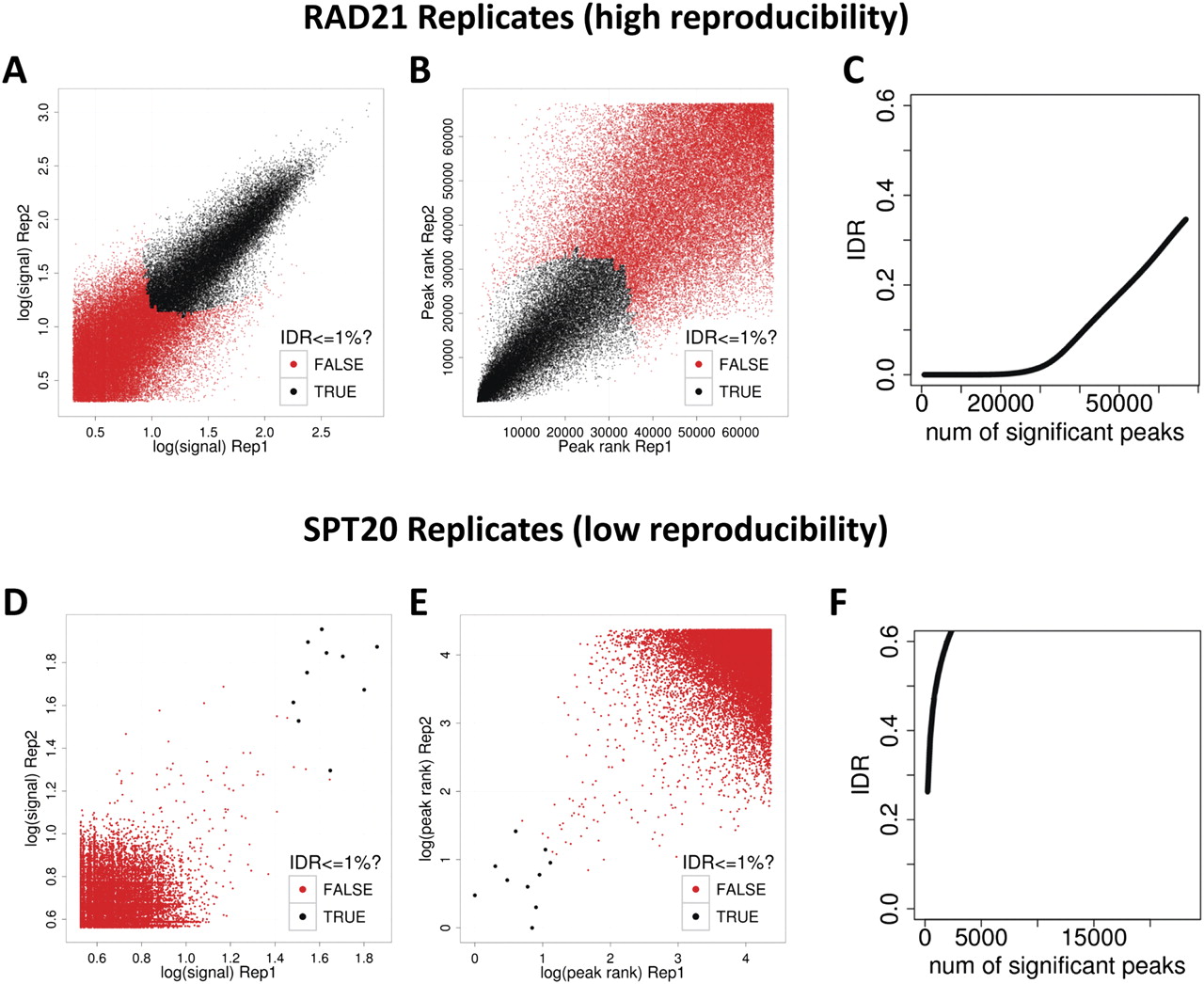 The irreproducible discovery rate (IDR) framework for assessing reproducibility of ChIP-seq data sets. (A–C) Reproducibility analysis for a pair of high-quality RAD21 ChIP-seq replicates. (D,E) The same analysis for a pair of low quality SPT20 ChIP-seq replicates. (A,D) Scatter plots of signal scores of peaks that overlap in each pair of replicates. (B,E) Scatter plots of ranks of peaks that overlap in each pair of replicates. Note that low ranks correspond to high signal and vice versa. (C,F) The estimated IDR as a function of different rank thresholds. (A,B,D,E) Black data points represent pairs of peaks that pass an IDR threshold of 1%, whereas the red data points represent pairs of peaks that do not pass the IDR threshold of 1%. The RAD21 replicates show high reproducibility with ∼30,000 peaks passing an IDR threshold of 1%, whereas the SPT20 replicates show poor reproducibility with only six peaks passing the 1% IDR threshold.