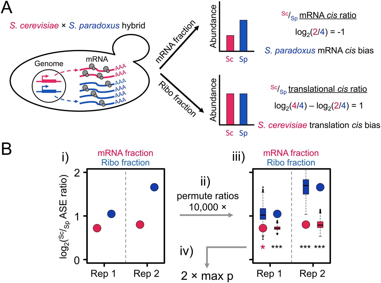 (A) Identifying cis-regulatory divergence at two levels. In the example, the S. paradoxus allele (blue) is transcribed at a higher level than that of S. cerevisiae (red), as represented by the larger number of wavy lines. However, the S. cerevisiae allele has higher translational efficiency, as represented by the larger number of ribosomes per transcript (pairs of gray circles). The S. paradoxus mRNA cis bias manifests as a negative log2(Sc/Sp) ratio in the mRNA fraction. If translational efficiency was unchanged between alleles, the more abundant allele, in this case S. paradoxus, would produce more footprints in the Ribo fraction. Therefore the translational cis ratio is obtained by dividing the Sc/Sp Ribo fraction ratio by the mRNA fraction ratio (which is equivalent to a subtraction in log2). The net log2(Sc/Sp) translational cis ratio is positive, indicating cis bias favoring S. cerevisiae translation. (B) Detection of significant translational divergence is based on rejecting the null hypothesis that the observed allelic ratios are not significantly different from one another (see A). The observed Sc/Sp ratios (red circles, mRNA fraction; blue circles, Ribo fraction) (i) were obtained directly from the replicates of the two fractions. (ii) These were permuted by resampling the base-level coverage of each allele with replacement 10,000 times, generating a distribution of Sc/Sp ratios that captures the interallelic variability in base composition, length, and read coverage. (iii) The distributions of permuted ratios (boxplots) were then each reciprocally compared with the corresponding observed ratio (e.g., the permuted distribution of Sc/Sp Ribo ratios [blue boxplots] was compared with the observed mRNA Sc/Sp ratio [red circles] and vice versa) for which a two-tailed P-value was calculated. If all comparisons agreed in the parental direction of allelic bias, then (iv) the least significant P-value (indicated by the red asterisk) was used as the representative for the comparison. See Supplemental Material for application of the test to the mRNA level and trans comparisons.