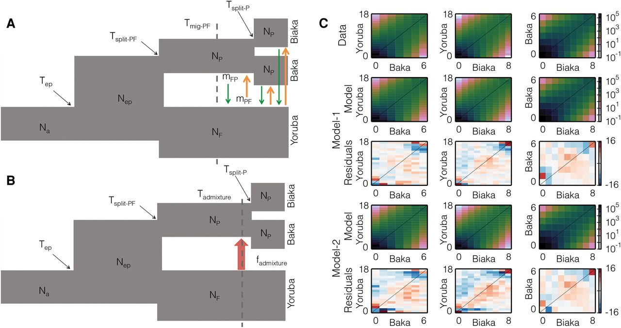 Best-fit demographic models and observed and predicted frequency spectra for African farmer (Yoruba) and Pygmy (Baka and Biaka) populations. (A) The continuous asymmetric gene flow model (Model-1) with the 10 free parameters labeled. (B) The single-pulse admixture model (Model-2) with the nine free parameters labeled. (C) The marginal spectra for each pair of populations. Row one is data, rows two (Model-1) and four (Model-2) are models, and rows three and five are Anscombe residuals of model minus data for Model-1 and Model-2, respectively.