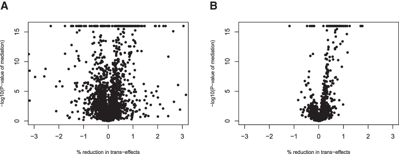 Plots of negative log base 10 of mediation P-values versus the percentages of reduction in trans-effects after accounting for cis-mediation. The P-values are calculated based on (A) mediation tests without adjusting for hidden confounders, and (B) mediation tests by GMAC considering all PCs as potential confounders. P-values are truncated at 10−16. The plots are based on the results from the adipose subcutaneous tissue. The percentage of reduction in trans-effects is calculated by (β2m − β2)/β2m × 100%, where β2m is the marginal trans-effect of the eQTL on the trans-gene expression levels, and β2 is the trans-effect after adjusting for a potential cis-mediator and other covariates. For trios with true cis-mediations, the marginal trans-effects are nonzero, and after adjusting for the true cis-mediators, we expect the adjusted trans-effects β2 to be substantially reduced; that is, we expect the trios with very significant mediation P-values to have positive percent reduction in trans-effects. For results based on no adjustment of hidden confounders (A), we observed many trios with significant mediation P-values but the percentages of reduction in trans-effects are negative. At the 0.05 P-value threshold, 712 (21.4%) and 188 (5.6%) out of 3332 trios have P-values below the threshold and percent reduction in trans-effects being negative in A and B, respectively.