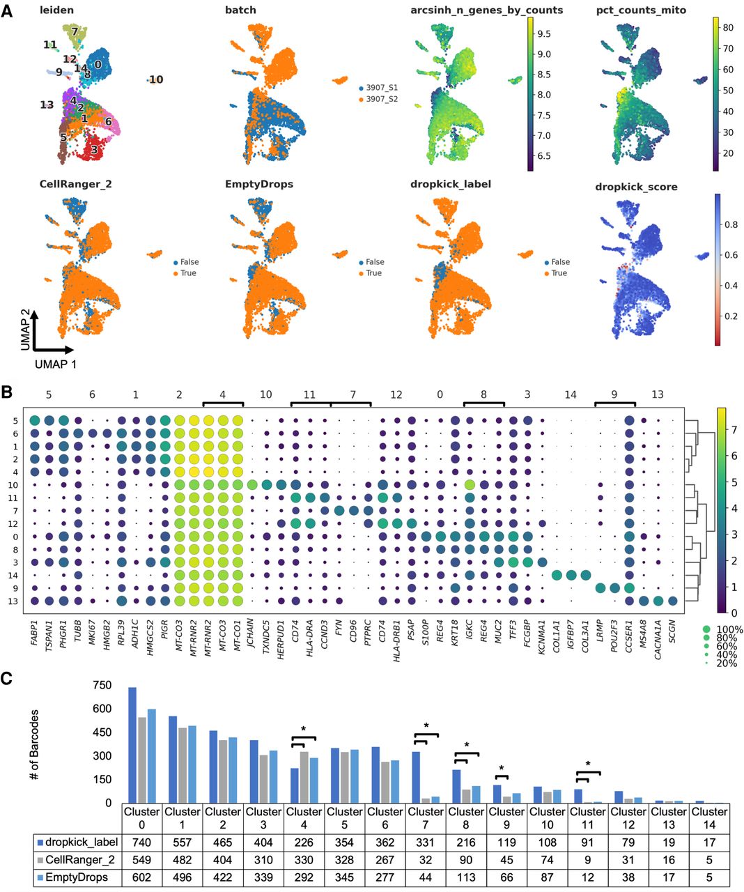 dropkick outperforms analogous methods on challenging data sets. (A) UMAP embedding of all barcodes kept by dropkick_label (dropkick score ≥ 0.5), CellRanger_2, and EmptyDrops for human colorectal carcinoma inDrop samples. Points colored by each of the three filtering labels, as well as clusters determined by NMF analysis, dropkick score (cell probability), arcsinh-transformed total genes detected, percentage counts mitochondrial, and original batch. 3907_S1 is normal human colonic mucosa, and 3907_S2 is colorectal carcinoma from the same patient. (B) Dot plot showing top differentially expressed genes for each NMF cluster. The size of each dot indicates the percentage of cells in the population with nonzero expression for the given gene, and the color indicates the average expression value in that population. Bracketed genes indicate significantly enriched or depleted populations in dropkick compared with CellRanger_2 and/or EmptyDrops labels as shown in C. (C) Table and bar graph enumerating the total number of barcodes detected by each algorithm in all NMF clusters for the combined data set. Significant cluster enrichment as determined by sc-UniFrac is denoted by brackets.