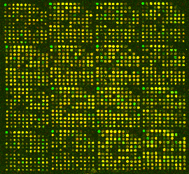 Red / Green false colour image of microarray. Green: C.jejuni 11168 , Red: C.jejuni test strain