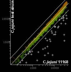 Scatter plot of C.jejuni 11168 vs. C.jejuni test strain. Genes selected as absent or highly divergent shown in white |